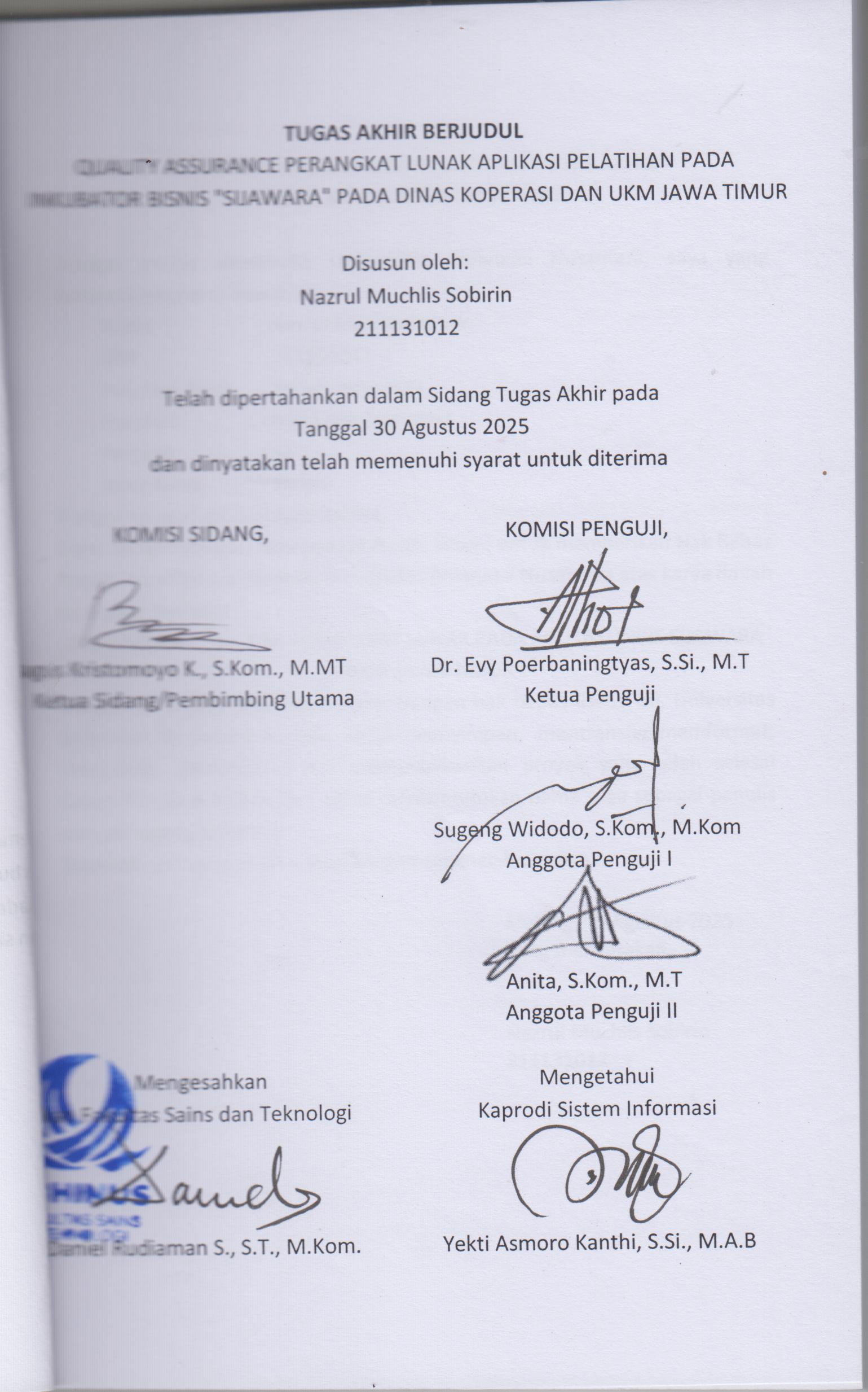 Sobirin, Nazrul Muchlis (2025) QUALITY ASSURANCE PERANGKAT LUNAK APLIKASI PELATIHAN PADA INKUBATOR BISNIS "SIJAWARA" PADA DINAS KOPERASI DAN UKM JAWA TIMUR. Sarjana thesis, Universitas Bhinneka Nusantara.