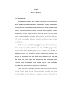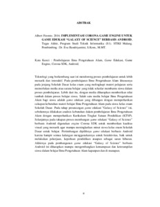 Kata Kunci : Pembelajaran Ilmu Pengetahuan Alam, Game Edukasi, Game Engine, Corona SDK, Android. Teknologi yang berkembang saat ini mendorong proses pembelajaran untuk lebih menarik dan interaktif. Pada pembelajaran Ilmu Pengetahuan Alam khususnya pada jenjang Sekolah Dasar kelas enam yang melingkupi materi pelajaran serta memerlukan media atau sarana belajar yang tidak sekedar membantu siswa dalam proses pembelajaran. Lebih dari itu, dengan media diharapkan memberikan nilai tambah dalam proses belajar siswa. Salah satu media belajar Ilmu Pengetahuan Alam bagi siswa adalah game edukasi yang dibangun dengan memperhatikan cakupan kebutuhan materi belajar Ilmu Pengetahuan Alam pada siswa kelas enam Sekolah Dasar. Pada tahap perancangan game edukasi ”Galaxy of Science” ini, sebelumnya dilakukan analisis kebutuhan dalam pembelajaran Ilmu Pengetahuan Alam dengan memperhatikan Kurikulum Tingkat Satuan Pendidikan (KTSP). Selanjutnya pada tahapan proses membangun game edukasi “Galaxy of Science” berbasis Android digunakan engine Corona SDK untuk memberikan kualitas visual yang menarik agar mampu meningkatkan minat siswa kelas enam Sekolah Dasar untuk belajar. Pertimbangan dipilihnya game edukasi berbasis Android karena hampir semua kalangan menggunakannya untuk beraktivitas, baik untuk melakukan pekerjaan, keperluan pendidikan ataupun sebagai saran hiburan. Akhirnya pada pembangunan game edukasi “Galaxy of Science” berbasis Android ini diharapkan mampu mengembangkan kemampuan dan keterampilan siswa dalam belajar Ilmu Pengetahuan Alam kapanpun dan di manapun.