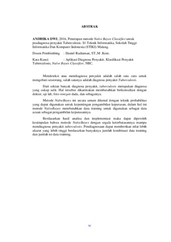 ANDHIKA DWI INDRA IRAWAN, ANDHIKA DWI INDRA IRAWAN (2016) PENERAPAN METODE BAYES CLASSIFIER UNTUK PRADIAGNOSA PENYAKIT TUBERCULOSIS. Sarjana thesis, SEKOLAH TINGGI INFORMATIKA DAN KOMPUTER INDONESIA MALANG.