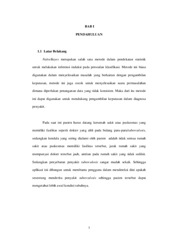 Kata Kunci : Aplikasi Diagnosa Penyakit, Klasifikasi Penyakit Tuberculosis, Naïve Bayes Classifier, NBC. Mendeteksi atau mendiagnosa penyakit adalah salah satu cara untuk mengobati seseorang, salah satunya adalah diagnosa penyakit Tuberculosis. Dari sekian banyak diagnosa penyakit, tuberculosis merupakan diagnosa yang cukup sulit. Hal tersebut dikarenakan membutuhkan berkonsultasi dengan dokter, uji lab, foto rontgen dada, dan sebagainya. Metode NaïveBayes ini secara umum dikenal dengan teknik probabilitas yang dapat digunakan untuk kepentingan pengambilan keputusan, dalam hal ini metode NaïveBayes membutuhkan data training untuk digunakan sebagai data acuan sebagai pengambilan keputusannya. Berdasarkan hasil analisa dan implementasi maka dapat diperoleh kesimpulan bahwa metode NaïveBayes dengan segala keterbatasannya mampu mendiagnosa penyakit tuberculosis. Pendiagnosaan dapat memberikan nilai lebih akurat yang lebih tinggi berdasarkan banyaknya jumlah kombinasi data training dan jumlah isi data training.