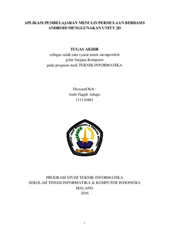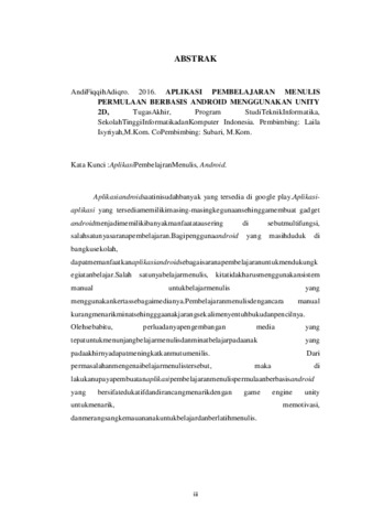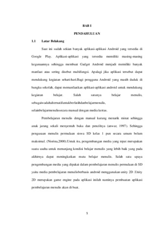 Kata Kunci :AplikasiPembelajranMenulis, Android. Aplikasiandroidsaatinisudahbanyak yang tersedia di google play.Aplikasiaplikasi yang tersediamemilikimasing-masing kegunaan sehingga membuat gadget android menjadi memiliki banyak manfaat atau sering di sebut multifungsi, salah satunya sarana pembelajaran.Bagi pengguna android yang masih duduk di bangku sekolah, dapat memanfaatkan aplikasi android sebagai sarana pembelajaran untuk mendukungk egiatan belajar. Salah satunya belajar menulis, kitatidak harus menggunakan sistem manual untuk belajar menulis yang menggunakan kertas sebagai medianya. Pembelajaran menulis dengan cara manual kurang menarik minat sehinggga anak jarang sekali menyentuh buku dan pencilnya. Oleh sebab itu, perlu adanya pengembangan media yang tepat untuk menunjang belajar menulis dan minat belajar pada anak yang pada akhirnya dapat meningkatkan mutu menilis. Dari permasalahan mengenai belajar menulis tersebut, maka di lakukan upaya pembuatan aplikasi pembelajaran menulis permulaanberbasisandroid yang bersifatedukatifdandirancangmenarikdengan game engine unity untukmenarik, memotivasi, danmerangsangkemauananakuntukbelajardanberlatihmenulis.