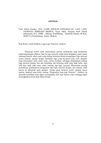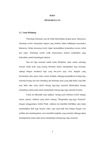 Kata Kunci: Game Edukasi, Lagu-LaguNasional, Android Teknologi mobile telah menawarkan potensi multimedia yang berkualitas untuk kepentingan edukasi. Saat ini lagu nasional sudah mulai dilupakan, pada zaman sekarang banyak sekali anak yang kurang berminat dalam mempelajari lagu nasional secara manual, apalagi dengan maraknya lagu yang ber-genre pop, rock, dangdut yang bertemakan cinta, putus cinta, cacian, keluhan, sehingga pengetahuan tentang lagu nasional kurang luas dan terkadang ada beberapa anak yang tidak hafal, lupa lirik atau tidak tahu sama sekali tentang lagu-lagu nasional dikarenakan kurang menariknya pembelajaran pengenalan lagu-lagu nasional dengan cara manual. Oleh karena itu dibuatlah suatu aplikasi berupa game berbasis mobile dengan sistem operasi Android yang berisi tentang “Pengenalan lagu-lagu Nasional”. Aplikasi ini memiliki kelebihan yaitu dapat menampilkan lirik lagu beserta video sehingga dapat meningkatkan minat anak dalam belajar.