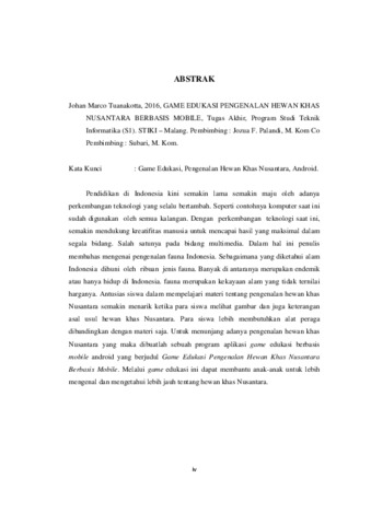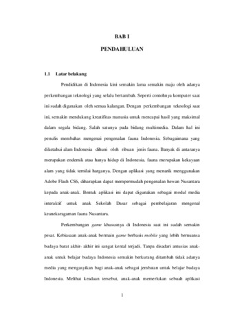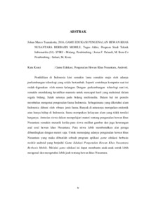Pendidikan di Indonesia kini semakin lama semakin maju oleh adanya perkembangan teknologi yang selalu bertambah. Seperti contohnya komputer saat ini sudah digunakan oleh semua kalangan. Dengan perkembangan teknologi saat ini, semakin mendukung kreatifitas manusia untuk mencapai hasil yang maksimal dalam segala bidang. Salah satunya pada bidang multimedia. Dalam hal ini penulis membahas mengenai pengenalan fauna Indonesia. Sebagaimana yang diketahui alam Indonesia dihuni oleh ribuan jenis fauna. Banyak di antaranya merupakan endemik atau hanya hidup di Indonesia. fauna merupakan kekayaan alam yang tidak ternilai harganya. Antusias siswa dalam mempelajari materi tentang pengenalan hewan khas Nusantara semakin menarik ketika para siswa melihat gambar dan juga keterangan asal usul hewan khas Nusantara. Para siswa lebih membutuhkan alat peraga dibandingkan dengan materi saja. Untuk menunjang adanya pengenalan hewan khas Nusantara yang maka dibuatlah sebuah program aplikasi game edukasi berbasis mobile android yang erjudul Game Edukasi Pengenalan Hewan Khas Nusantara Berbasis Mobile. Melalui game edukasi ini dapat membantu anak-anak untuk lebih mengenal dan mengetahui lebih jauh tentang hewan khas Nusantara.