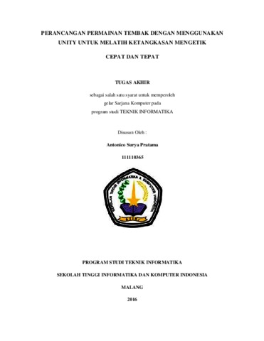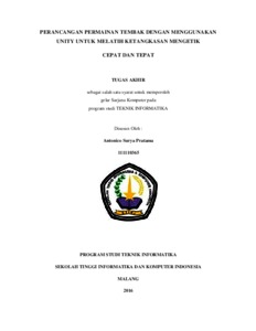 Kata Kunci : Game, Arcade shooting 2D, Quick typing, Unity Sudahadabanyaksekali tutorial tentangpengetikancepatdantepat. Namunsamaseperti tutorial lainnya, semuanyacenderungberakhirhanyasebagaibacaansajadantidakmemberikandampakpositif yang efektifdalammengetikcepatdantepat.Sementarakemampuanmengetikcepatdantepatsangatdibut uhkanuntukoptimalisasipada proses penggunaankomputer. Perkembangan teknologi dalambidang game dapat dimanfaatkan untuk menciptakan game yang dapatmelatihketangkasanmengetikcepatdantepat. Dari kedua pernyataan diatas, dapat ditarik kesimpulan bahwa game mampumenjadisebuahpelatihanuntukketangkasandalammengetikcepatdantepat.Pembuatan game yang melatihketangkasandalammengetikcepatdantepatadalah sebuah terobosansebuahpelatihan untuk memaksimalkankemampuandalammengetik. Penulis memutuskan untuk mengangkat tema Teknologi Informasi dalam penelitian yang berjudul “PerancanganPermainanTembakdenganMenggunakan Unity untukMelatihKetangkasanMengetikCepatdanTepat”. Permainaninimenggabungkanduajenispermainanyaituactiondanquicktypingdimanapemainmenggerakkankarakterutamadarititikawalketitikakhirmelewatirintangand anmengalahkanmusuh, danmenyelesaikantantanganmengetikcepat yang adadalamsebuahplatform dandapatditemukan di dalamsetiap level. Dengan adanya permainan ini, melatihketangkasanmengetikcepatdantepatakanmenjadilebihmenarik, karena adanya perpaduan antara berlatih dan bermain.